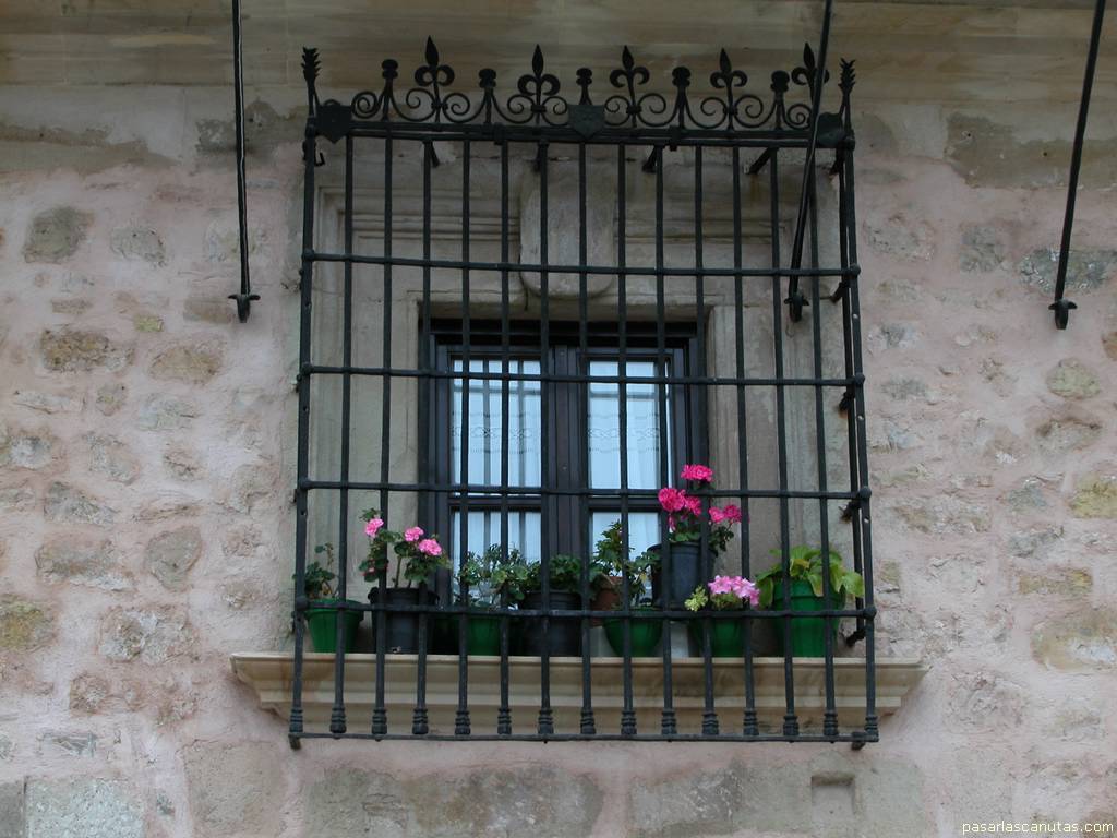 ventana con reja y macetas con geranios