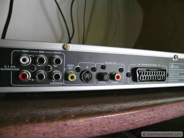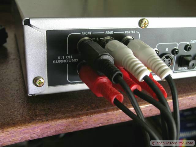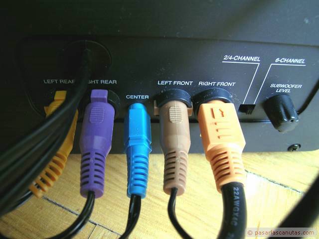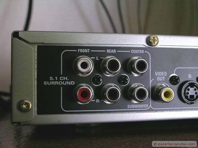 ![]() A la izquierda de esta foto se pueden ver las seis salidas analógicas 5+1: front L y R (frontales izquierda y derecha), rear L y R (traseras izquierda y derecha), center (central) y subwoofer (altavoz gordo de graves). |