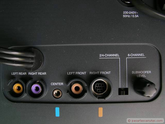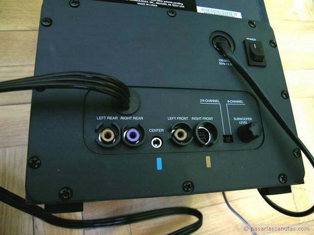 ![]() ... detalle de las salidas, todas diferentes para evitar errores de conexión, el conmutador de estéreo a 5+1, y el botón de volumen del subwoofer (importantísimo si vives en un piso, porque atruena) ... |