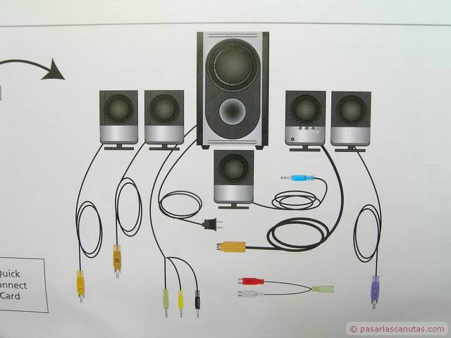 ![]() ... aquí vemos conectados ya los cinco altavoces, cada uno en su color (después de haberlos posicionado en la habitación convenientemente) ... |