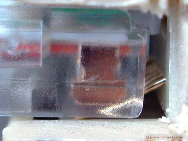 ... detalle del punto de contacto, que se ve a través de la caja transparente del conector macho rj-45 ...