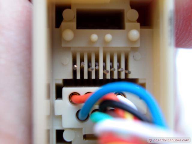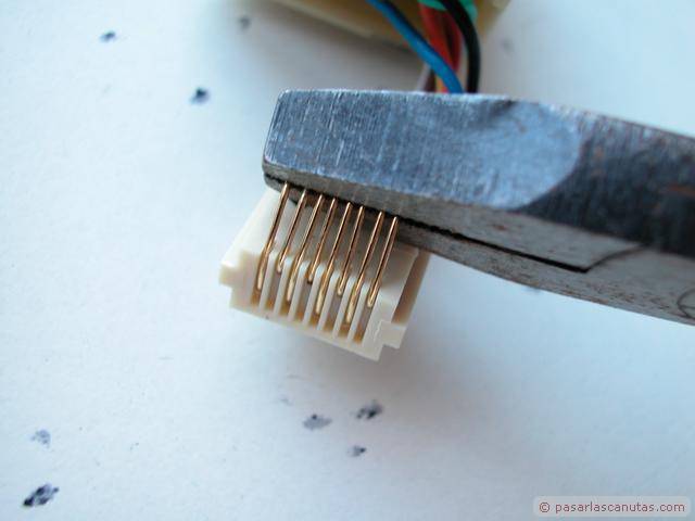 Bueno, decido desmontar los conectores hembra rj45 del adaptador recién modificado y doblo los hilos con unos alicates planos ...
