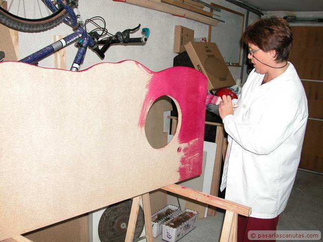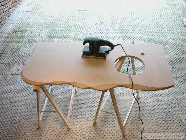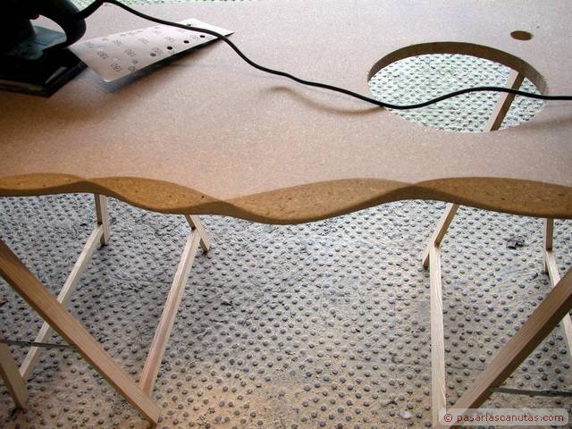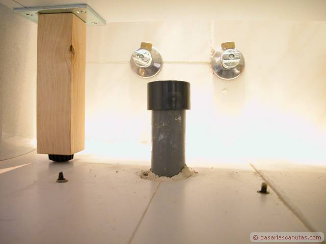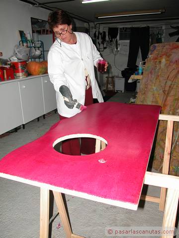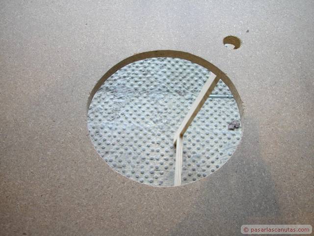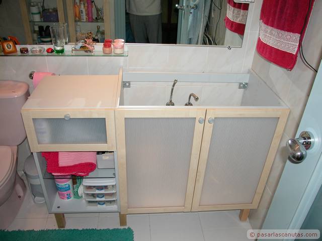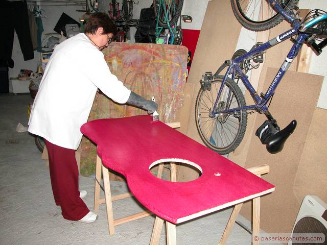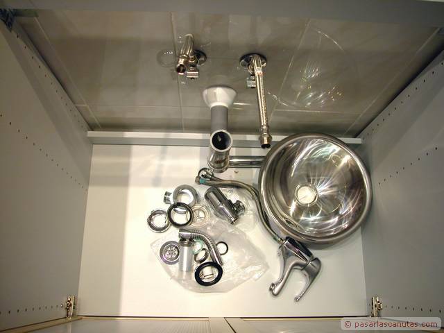 En este manual - tutorial gráfico, mezcla de carpinteria imaginativa y bricolaje de fontaneria os mostramos el montaje doméstico de un prototipo experimental de encimera de mueble de lavabo realizada en madera de aglomerado, coloreada con anilina al agua, impermeabilizada con un producto normalmente usado en aplicaciones profesionales de conservación y que soporta los rigores de la intemperie, el Paraloid B-72, y por último barnizada con barniz crema de poliuretano. Es una secuencia de 140 fotos que se pueden ampliar al tamaño 640 x 480. El texto de cada cuadro está relacionado con la foto junto a la que está situado. Con bastante probabilidad se trata de la primera encimera de mueble de lavabo realizada con madera de aglomerado: estamos convencidos de que a partir de ahora, y debido al precio actual del Paraloid B72, menos de 18 €/Kg., vamos a ver cómo este producto, cuyo uso ha estado restringido casi totalmente al ámbito profesional de la restauración, se empieza a emplear en aplicaciones domésticas. El tutorial se ha tomado de la vida real, como de costumbre en Pasarlascanutas. Esta encimera lleva unas cuantas semanas instalada en nuestro propio cuarto de baño. Después de haberle dedicado unos minutos a la posible idea de encargar la típica encimera de mármol, decidimos ser atrevidos: eso es lo que verdaderamente nos gusta, intentar abrir nuevos caminos. Seguro que a muchos de vosotros se os van a ocurrir otros usos para el Paraloid B-72. El resto del reportaje es bricolaje de fontanería: incluye la instalación del grifo monomando desmontado de la instalación anterior y la instalación de un pequeño lavabo de acero inoxidable encastrado en la encimera. En realidad se trata de tres tutoriales, uno a continuación de otro: Fabricar una encimera de mueble de lavabo en madera de aglomerado impermeabilizada con Paraloid B-72, instalar un grifo monomando de lavabo, e instalar un cuenco de lavabo de acero inoxidable y su correspondiente desagüe. Las marcas registradas son propiedad de sus respectivos propietarios