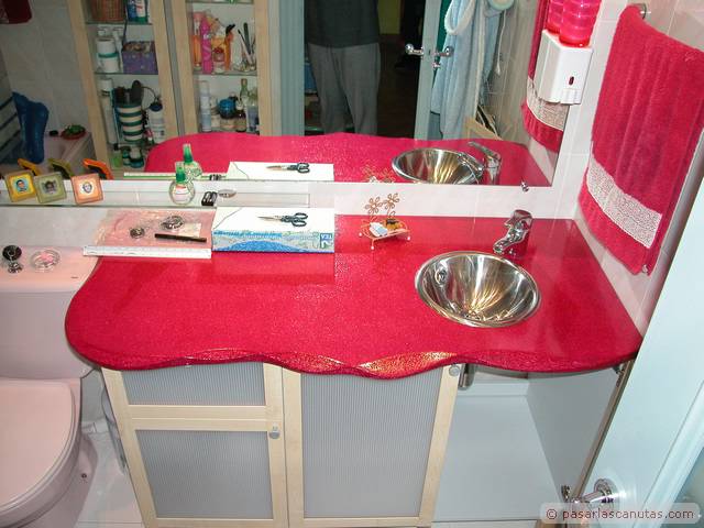 Esta página es continuación de los reportajes: Construir una encimera de lavabo con madera de aglomerado, colorear con anilina, impermeabilizar con Paraloid B-72 y barnizar, y de Instalar un grifo monomando de lavabo