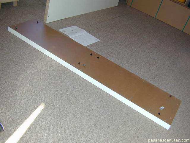 ... para ensamblar la base de la estantería al costado izquierdo. Se deben colocar de manera que se vean por atrás (cuidado porque en ambas tablas se deben ver los taladros para instalar los tirantes posteriormente) |