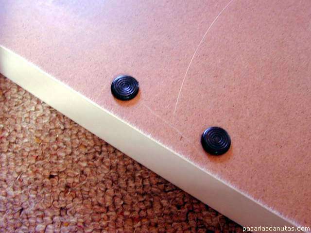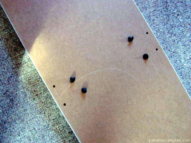 | Ahora viene una parte a la que conviene prestar especial atención. La pieza que se ve en la fotografía de la derecha, tiene que entrar por el taladro lateral de la tabla ... |