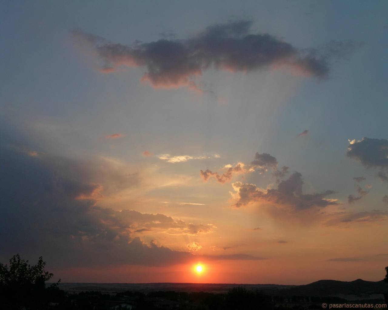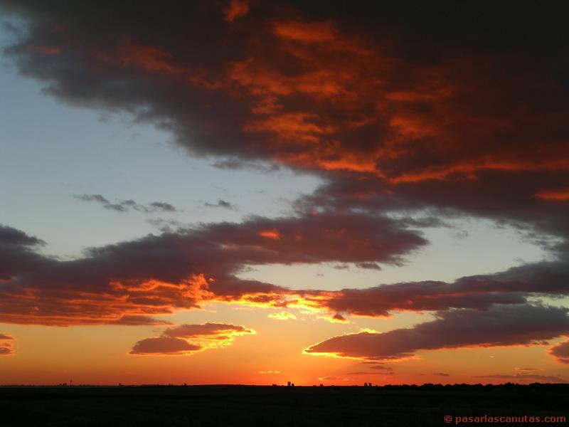 | foto de paisaje de atardecer en Madrid, visto desde Ajalvir En la línea del horizonte se pueden distinguir a la izquierda el "pirulí" (la torre de comunicaciones), en el centro torre Picasso y a la derecha las torres inclinadas de la plaza de Castilla. |