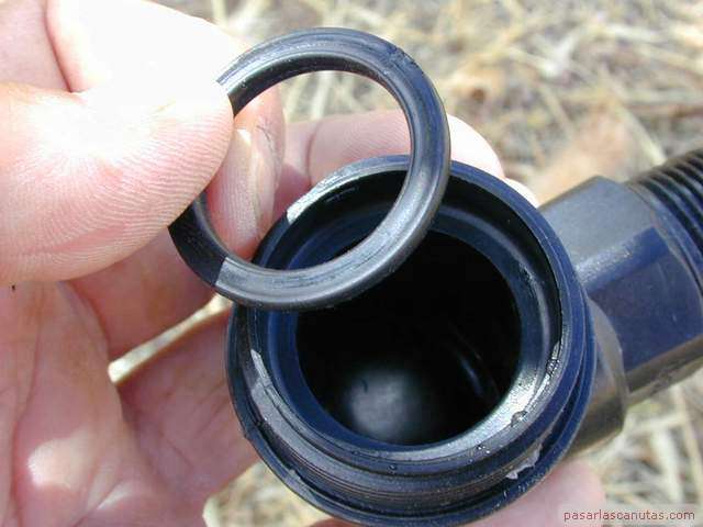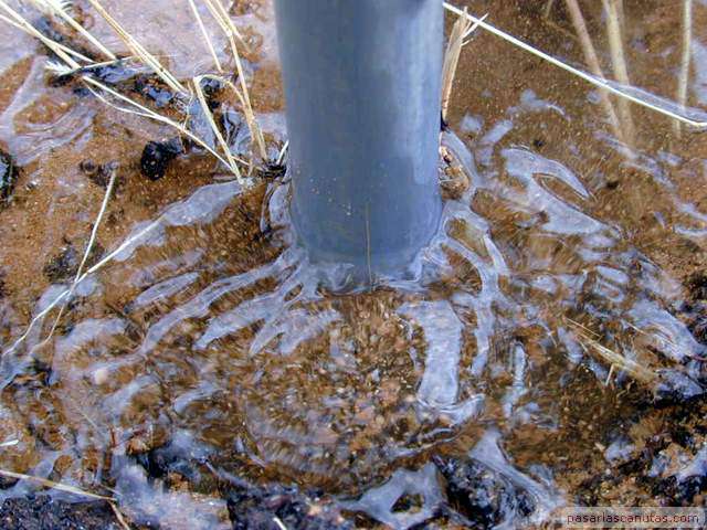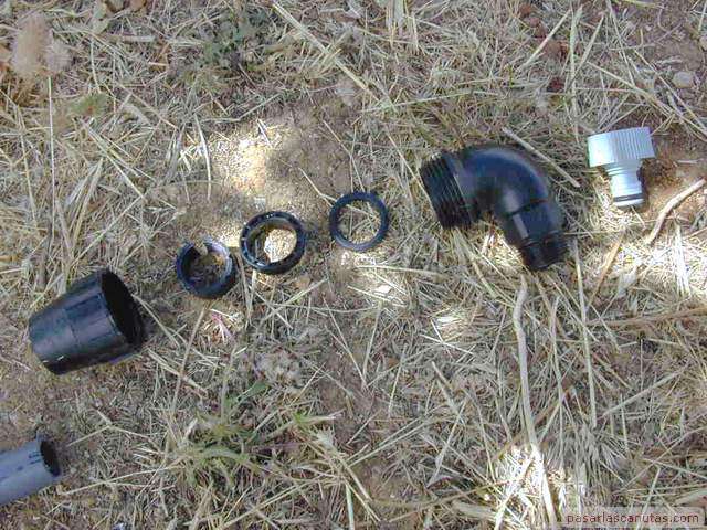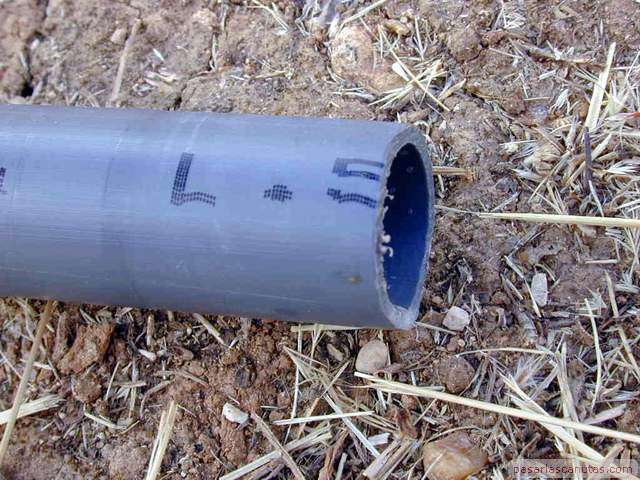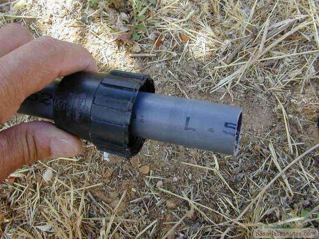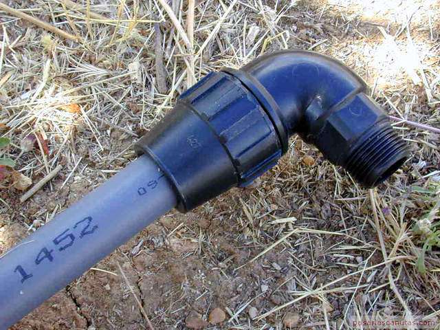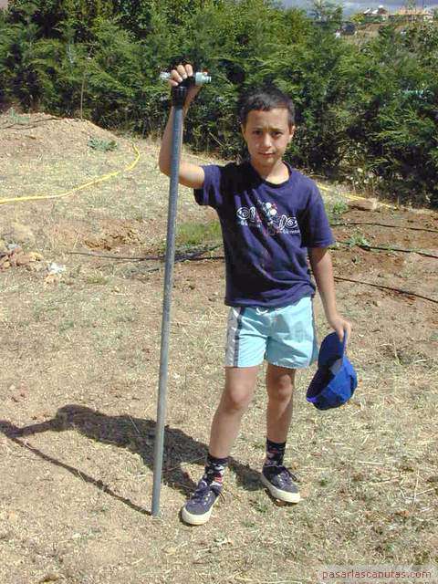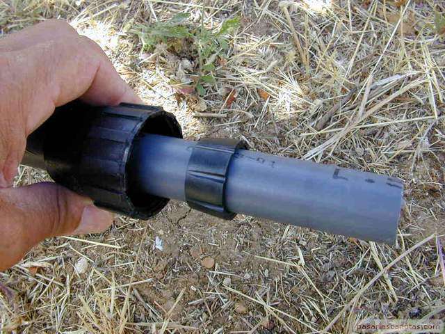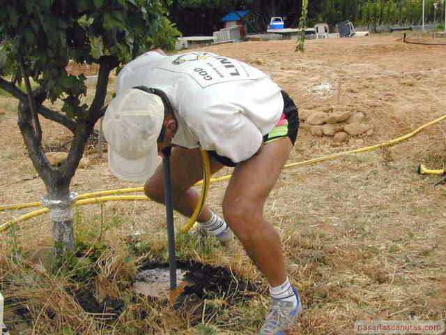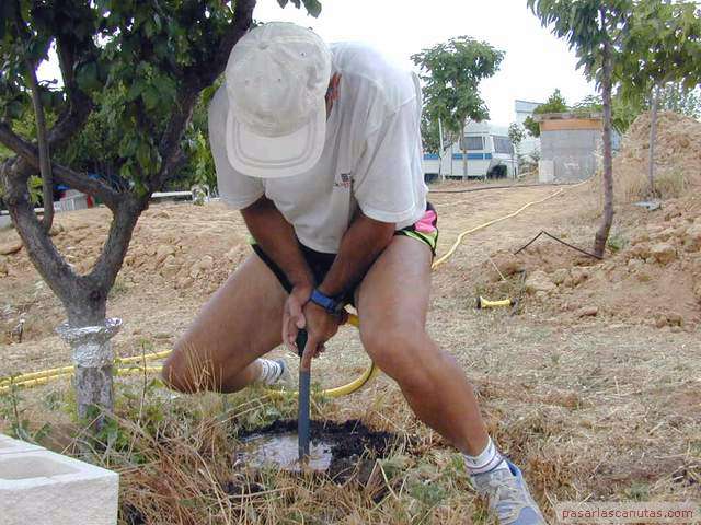 o enterrado en un árbol de un huerto familiar. No es necesario ningún tipo de gotero especializado antiraíces ni instalación o herramienta especial. Esta istalación está basada en la inserción de un trozo de tubo de polietileno de 25 mm., de los utilizados en la conducción de agua, en las proximidades del tronco del árbol. Esto es posible realizarlo en la mayor parte de los casos, sin necesidad de maquinaria de perforación, simplemente con ayuda de un utillaje muy sencillo y barato: "el taladro de agua de pasarlascanutas" cuya construcción se describe también. En la parte superior del tubo se instala un gotero ajustable normal con una tapita, de manera que el riego por goteo que se genera a nivel de superficie, baja por el tubo hasta una profundidad de 1m., aproximadamente, o la que se desee, según la profundidad que se alcance con el taladro de agua y posteriormente con el tubo de polietileno. Por tanto, no es necesario ningún gotero especializado, ni sofisticados mecanismos de control antiraíces ni ninguna otra cosa. El funcionamiento del gotero se puede revisar y ajustar en cualquier momento fácilmente, puesto que queda accesible y no enterrado. La mancha de humedad del riego por goteo se produce a una profundidad de 1m. o a la que hayamos decidido insertar el tubo. |