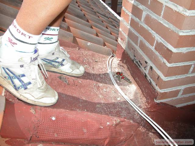 ... detalle de las zapatillas de gran agarre (el tejado está totalmente seco, si no, no me subo) y de dónde dejo los demás tornillos para que no se caigan ...