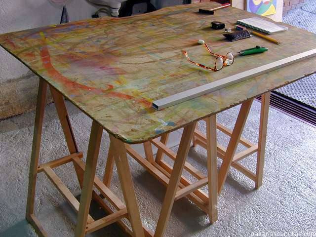 Detalle de la mesa auxiliar que he montado con un viejo tablero y borriquetas.