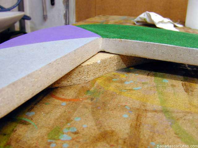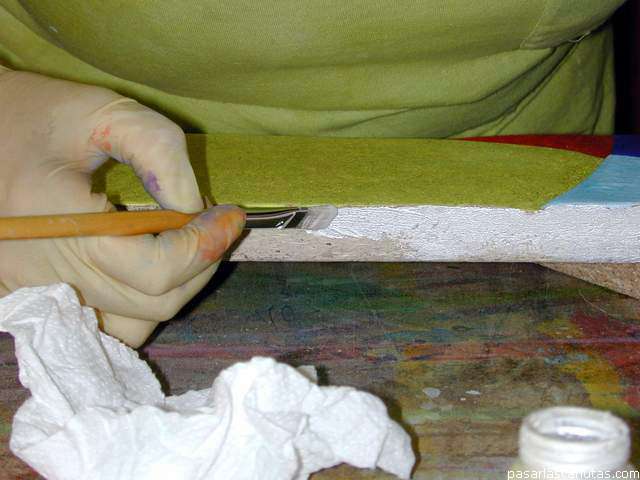 Para aplicar la pintura del hueco interior, hemos levantado el marco sobre restos del tablero.