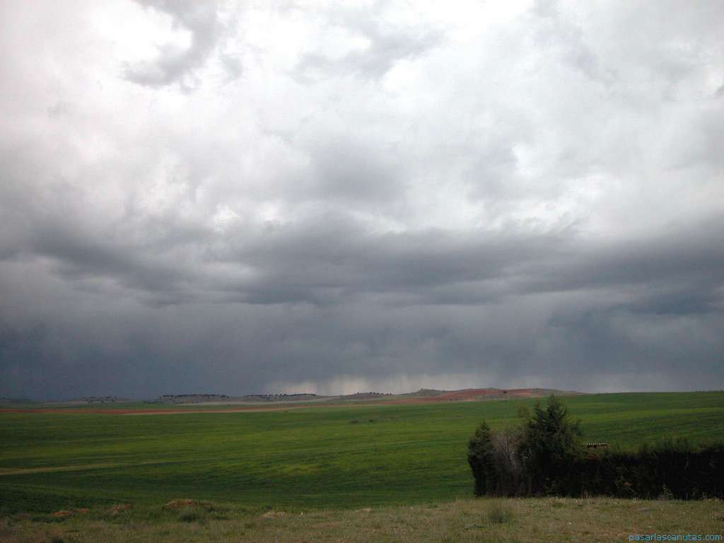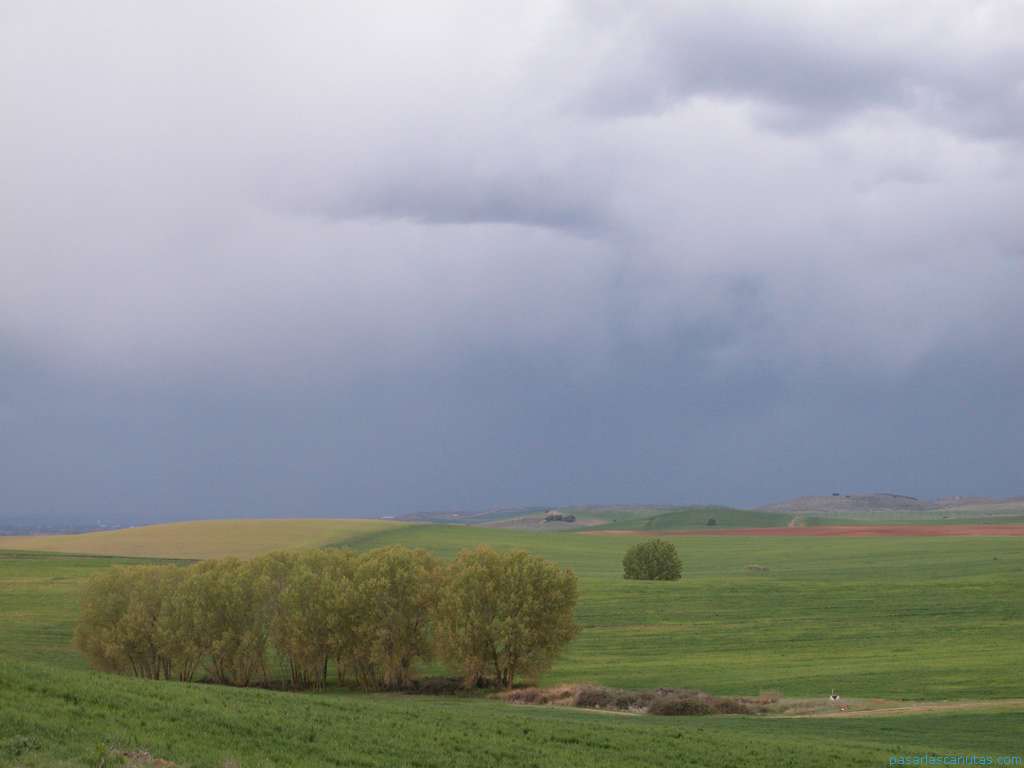 paisaje de campos de cereales y árboles con fondo de tormenta en Serracines