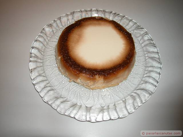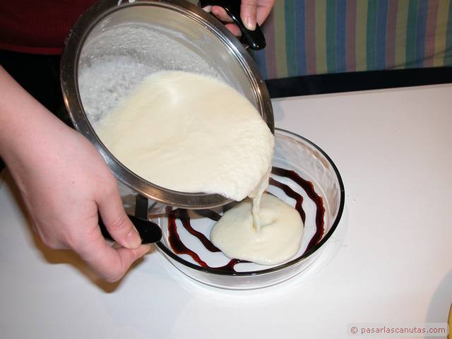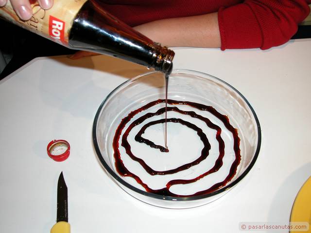 ... y en el recipiente o molde de cristal que dará forma a la tarta, ponemos un poco de caramelo líquido ...