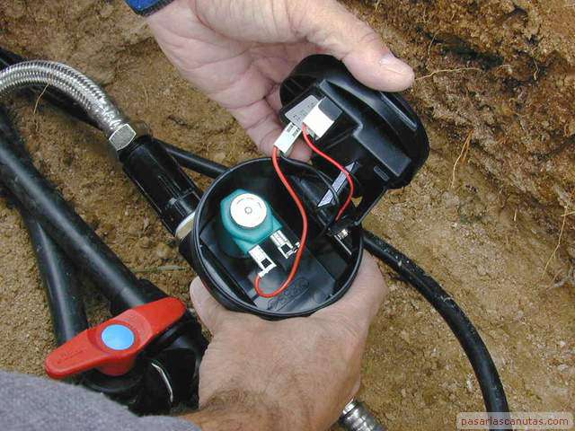 ... la pila de 9 Voltios, única conexión eléctrica de esta instalación de riego por goteo.
