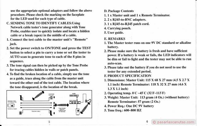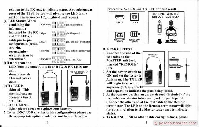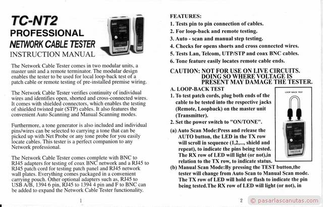 Pequeño tutorial en 64 fotos sobre cómo realizar pruebas sobre un cable UTP de red LAN RJ-45. Utilizamos en este caso un pequeño tester de bolsillo (examinador de red para cables tipo UTP, STP, Coaxial y Modular, código de Trendnet TC-NT2) que puede realizar pruebas secuenciales de continuidad y cruces sobre cada conductor, y que puede usarse también para pruebas similares sobre otros tipos de cables (con los adaptadores correspondientes, algunos opcionales que hay que pedir aparte). Es un equipo de prueba muy sencillo y económico que lógicamente no realiza pruebas de respuesta en frecuencia ni diafonía, y por tanto, no caracteriza la categoría de la conexión. Las pruebas se tienen que realizar sobre los cables desconectados, no sometidos a tensión. Este aparato de comprobación puede ser útil, tanto para pruebas básicas profesionales, por su transportabilidad y facilidad de uso, como en colegios y pequeñas empresas, en donde un aparato más complejo no se usaría frecuentemente. En uso doméstico no será muy frecuente, aunque este reportaje obedece a la curiosidad que muchos me habéis expresado. En el reportaje construir un cable cruzado podéis ver la forma de hacer un cable cruzado, con detalle del crimpado del cable UTP tanto al conector macho RJ45 con la conexión T568B (en este caso directa) como con la conexión T568A (en este caso cruzada). Se puede ver en la tercera página de este reportaje una chapuza para improvisar un pequeño útil de uso doméstico para conectar rosetas RJ45 Cat5 en este ambiente doméstico. En aplicaciones profesionales, lógicamente, es obligado el uso de la herramienta al efecto, que en el caso del fabricante Trendnet tiene el código TC-PDT (herramienta de punch down). Nuestro agradecimiento a Flytech por habernos cedido el aparato de prueba de cables de red para la realización de este reportaje. |